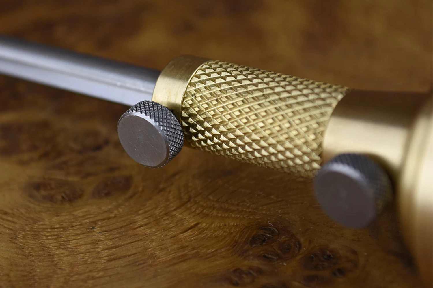The three component head of this marking gauge features opposing threads giving a very fine micrometer style adjustment. If necessary it can be unlocked, adjusted and re-locked with one hand. The knurled stainless screws engage in a v-groove milled into the stem providing a very secure lock and preventing any rotation during use. The hardened tool steel cutter retracts into recess in the head, keeping it safe from damage when not in use. At 215g it has a nice hefty solid feel in the hand. This Taiwanese manufactured version doesn’t quite have the smoothness of action of the U.S. made original, but it is perfectly serviceable and less than half the price. Total Length: 185mm / 7¼” Adjustment Length: 150mm / 6″. Adjustment Graduations: 1mm / 1/16″