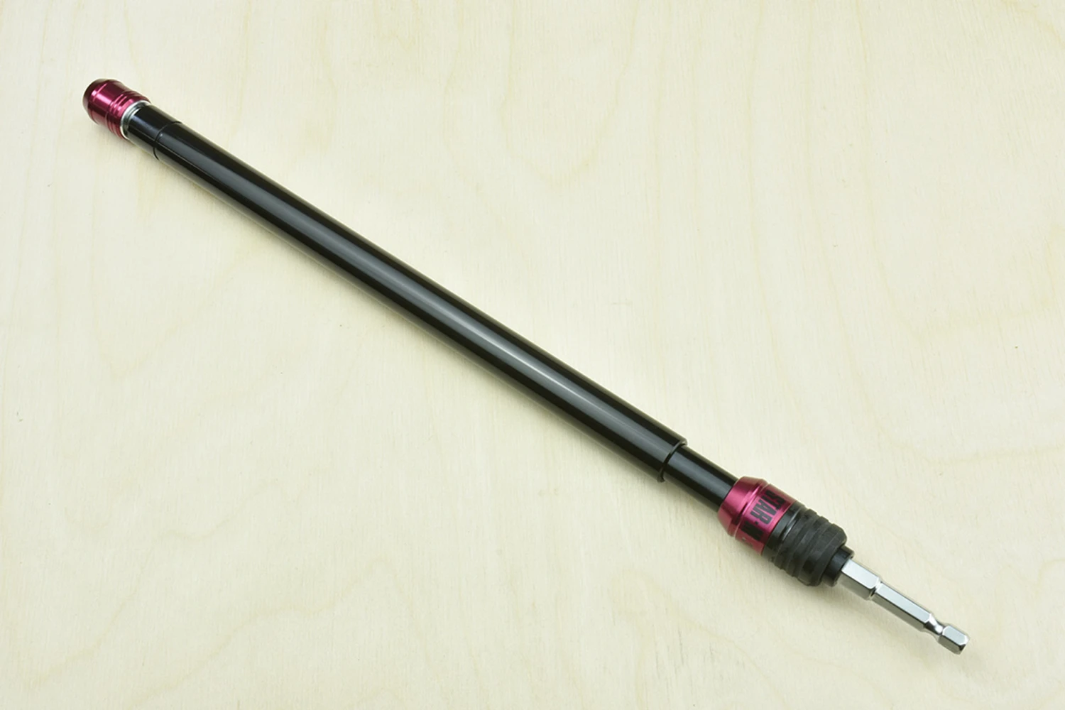 Now here’s a clever idea. A three stage extendable extension that gives you 350mm, 400mm, 450mm, 500mm, 550mm or 600mm of extra reach on your hex shank drills and driver bits so that you can adjust it for the situation at hand and still retain maximum control. It is designed to get to those awkward places, definitely NOT for drilling deep holes.Beautifully from high quality materials, the quick change hex chuck is made to suit Western hex shank bits, which are shorter than Japanese ones. Construction: Aluminium and alloy tool steel Lengths: 350mm, 400mm, 450mm, 500mm, 550mm & 600mm Hex: 6.35mm Western Speed: less than 3,000 rpm Made in Japan