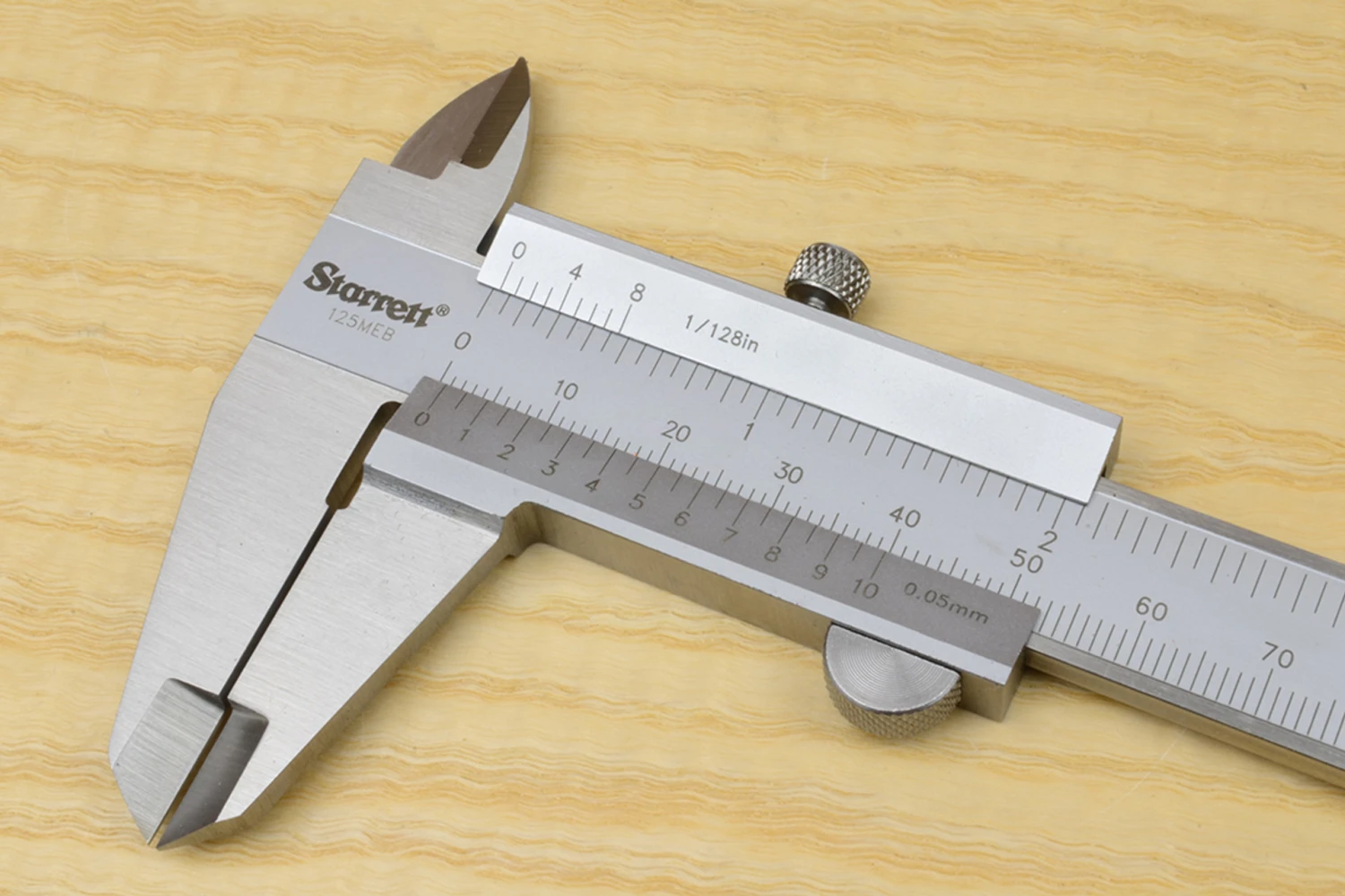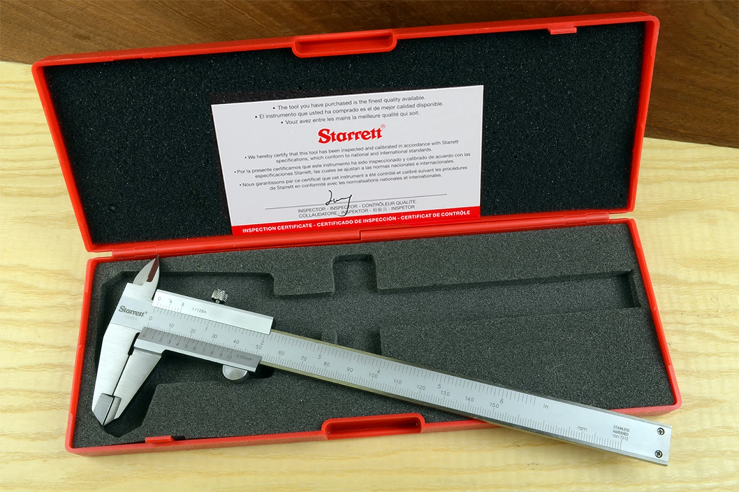 The Vernier caliper provides accurate measurements of inside diameter, outside diameter and depth by using opposing scales to provide a much finer measurement than would be possible with a simple rule.The mm scale on the Starrett 125 is a retrograde vernier (the vernier scale is more widely spaced than the main scale) this makes it much easier to read and accurate to 0.05mm rather than the 0.20mm commonly found on direct verniers.The method of use is exactly the same – just take the crude measurement on the main scale, then look for point where the two scales align and read off the parts of a mm on the vernier scale.If you are an inches person who prefers 32nds and 64ths to decimal inches, the imperial scale reads in exactly the same way and will take you down to 128ths.A lovely bit of 15th century technology that still serves its purpose very well.Graduations Imperial: 1/128thGraduations Metric 0.05mmMeasuring accuracy Inches +/- 0.001 inch at up to 4 inch, +/- 0.0015 inch at 4 inch to 6 inch.Measuring accuracy mm +/- 0.025mm per 300mmSupplied in a fitted, foam lined plastic case.