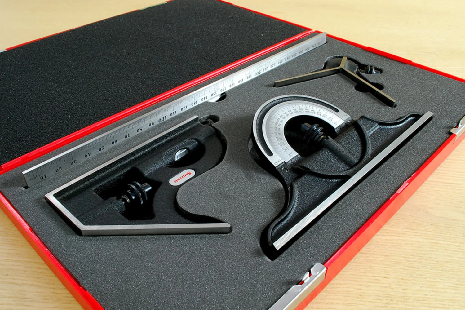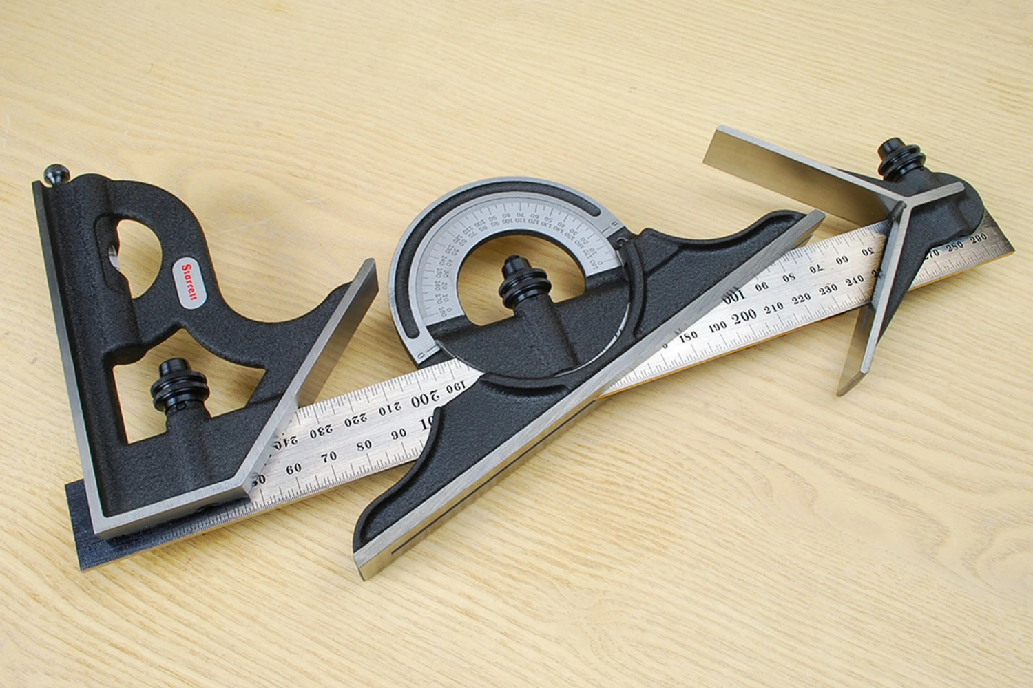 The full Starrett combination set with precision ground cast iron square head, centre head and reversible direct reading 180º protractor.Both sides of the 300mm hardened steel blade are engraved with full mm on one edge and half mm on the other, the rule is flippable and (by reversing the retaining clip) reversible, so you can get either whole mm or half mm, ascending or descending, from any of the four corners of the face.The reversible protractor has a broad foot with a slot down the middle for the rule, so it can register from either face / edge of the work, (non reversible protractors only have the foot on one side) both are read from one side.The centre finder is also designed to be used independently as an internal square, the apex is relieved to allow for burrs on the corner of the work. With the blade inserted it can reliably find the centre of round or near round objects up to 40cm in diameter.The square head incorporates a spirit level, which because it’s on a square also gives plumb, with accurately precision ground faces at 90 and 45 for the obvious use, and a scriber screwed in at one end, not quite as nice to use as a proper scriber, but it’s always to hand as a back up. The square and centre heads are ground to the same thickness and lie flat on both sides, so they can be used to elevate a workpiece to clear a protruding feature. Because the rule slides it can be set to a given length for go / no-go measurements or used as a depth gauge.The heads on this version are cast, denoted by the crinkle finish. Cast heads are more dimensionally stable, forged heads are stronger, we have never heard of anyone breaking a Starrett cast head.Although there is no current standard for combination squares, Starrett continue to manufacture to a now obsolete U.S. federal specification of 0.004in per foot max deviation between the square head and the blade, 3 minutes of a degree max deviation for centre heads, 15 minutes of a degree for protractor heads with blade edges straight to 0.001in.All standard Starrett combination set components are interchangeable, (Laroy Starrett was inspired by the working standards Samuel Colt in this regard and it has been retained ever since) so if you decide after ten years to add a longer rule for example, you can be confident that everything will still work together with no loss of accuracy.Packaging: Fitted Foam Lined ABS case