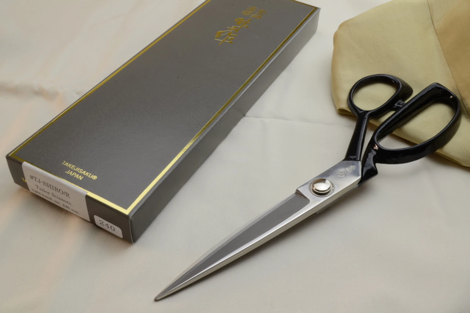 Tajika Haruo Scissor Works is a father and son operation from Ono City in the Hyogo prefecture, near to Kobe (where the beef comes from) and Miki (the Japanese equivalent of Sheffield). The firm was started in 1928 by Takeji Tajika, and his grandson Takeo and great grandson Daisuke now continue the family tradition of quietly and carefully producing the worlds finest handmade scissors.You need a good pair of dressmaking scissors to slice through heavy cloth, and a really really good pair to cut near-weightless float away fabrics with precise control.These beautifully balanced handmade dressmaker’s scissors from Japan, with their heavy, razor-sharp, laminated blades will cope admirably with both extremes and everything in between.Edge steel – hand forged Yasukihagane white paper No.1Please note: Because these scissors are made entirely by hand there may be a slight variance from the stated dimensions. The focus is on flawless performance rather than exact dimensional conformity.240mm