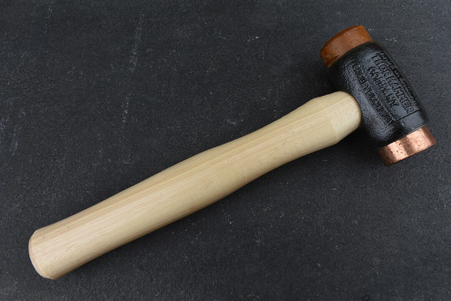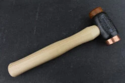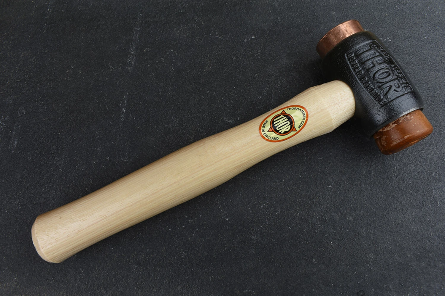 Introduced in the 1930’s, the classic Thor copper faced or copper / hide faced hammers were popularised by being included in car toolkits for undoing and tightening the spinners in the middle of spoked wheels. Over the years motoring enthusiasts discovered that they’re also just the job for freeing off seized drum brakes, easing apart machined castings and nudging things home without the risk of denting or cracking them. As well as being a excellent soft faced tool for the automotive industry they have since proved their usefulness in all sorts of general engineering, millwrighting and industrial situations and remain the company’s most popular products to this day.In the 1970’s the beautiful branding cast into the head was replaced with just a number on the side and a sticker, thankfully some bright spark squirrelled away the original dies and they have recently been brought back into service to produce the Classic range.This version has the Thor branded head fitted with two copper faces to give a safe but high-impact blow. The copper faces are designed to wear and mushroom over the malleable iron head, at which point the hammer is ‘worn in’, the hammer is ‘worn out’ when the malleable iron reappears with a little copper circle in the centre – it usually takes decades of hard use to get from one condition to the other. In theory the faces are replaceable but it’s a right bear of a job (classic apprentice task) and usually works out cheaper to use the hammer to destruction and buy a new one.Branded Head Weight: 1070g Face: 38mm / 1½” Ash wood handle If buying to complete an O/E toolkit please check with your classic car club to ensure the correct size/spec of hammer for your vehicle.