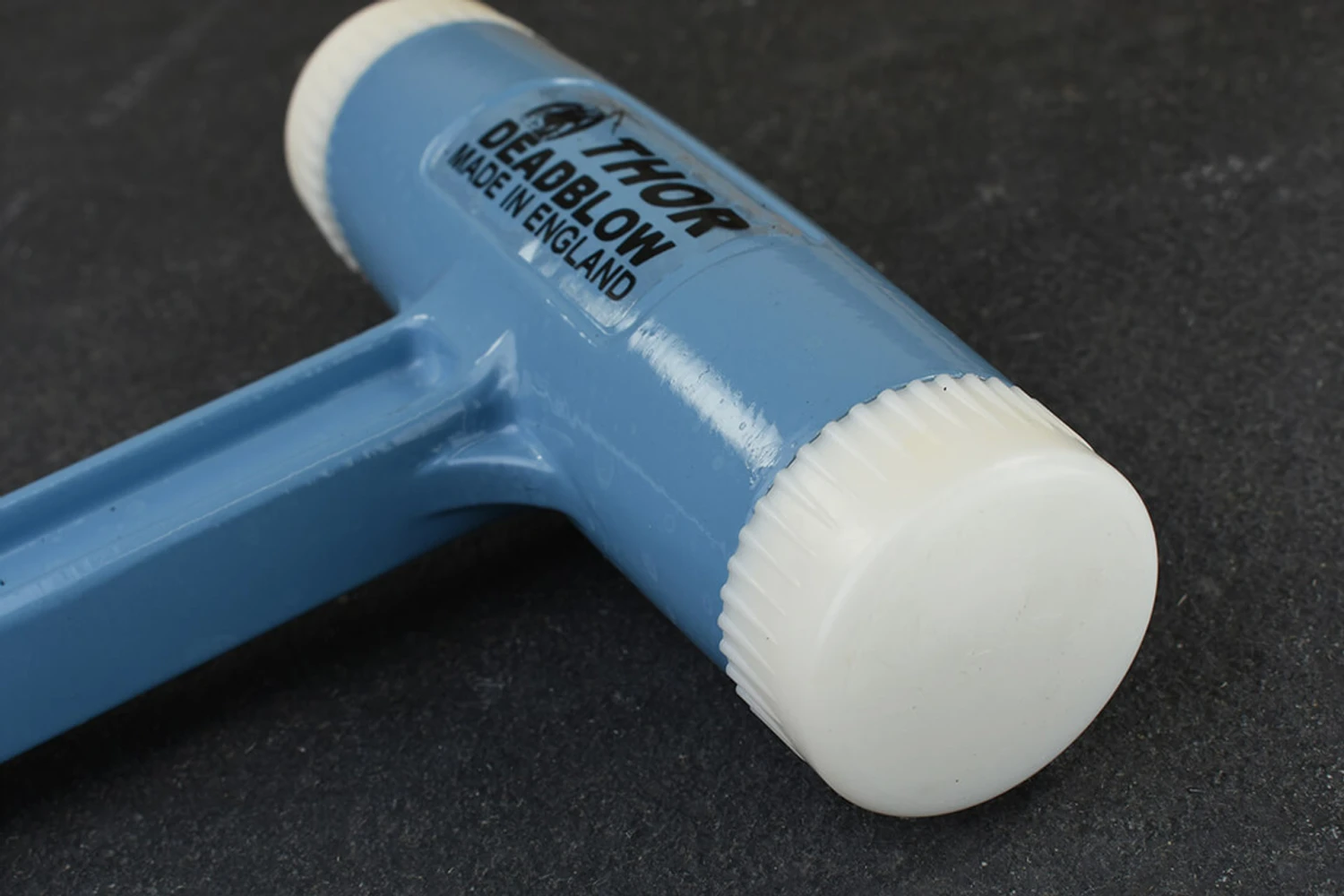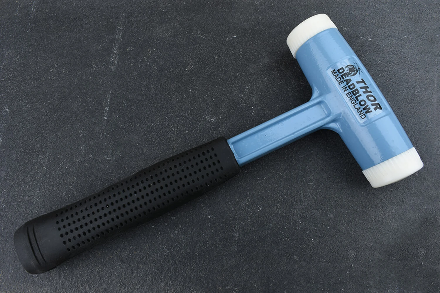 The Thorace die cast aluminium dead blow hammer delivers the absolute stone cold deadest blow of any hammer I’ve ever used, there’s no bounce whatsoever, so all of the energy goes straight into the thing that you are hitting.The hollow head is partially filled with steel shot, which adds to the weight, prevents rebound and delivers blows of maximum force.Used, due to the easily interchangeable faces, as a multi purpose striking tool and is ideal for sustained and effective blows without recoil.Commonly used in most assembly/fitting applications including engineering, toolmaking, shopfitting, partitioning, double glazing etc. Faces are designed to wear and to be replaced by hand. All faces are one piece moulded. No metal pegs or inserts to damage the workpiece when worn. Serrations in the metal head prevent faces coming loose during use. Faces have a shoulder for extra strength and to prevent fracture from misdirected blows. Weight: 700g Face diameter: 38mm (1½”) Fitted as standard with screw in white hard nylon faces.