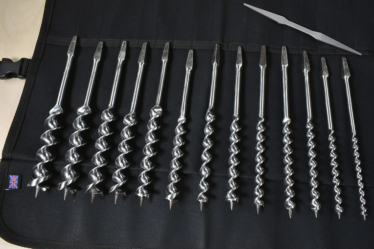 A beautiful, complete, and fairly rare set of 13 Jennings pattern bits 1/4″ to 1″ by sixteenths. The Tyzack family’s involvement in the Sheffield tool industry goes right back to the beginning of the industrial revolution in the 1740s, what is now the Abbeydale museum was one of their factories. Although these bits are post 1880’s they are marked ‘solid steel” presumably to differentiate them from steel augers forge welded to wrought iron shafts. All are in very good condition except for the 1/2″ which is present but has clearly been used a lot more than the other sizes. To preserve the completeness of the set it has been retained and an equivalent almost unused 1/2″ bit by CT Skelton of Sheffield added to be used in its place. Skelton and Tyzack eventually merged – hence the connection. Supplied with one of our auger bit tool rolls and double-ended auger file. These auger bits are pre-owned and not covered by our Lifetime Warranty – please see Terms and Conditions.