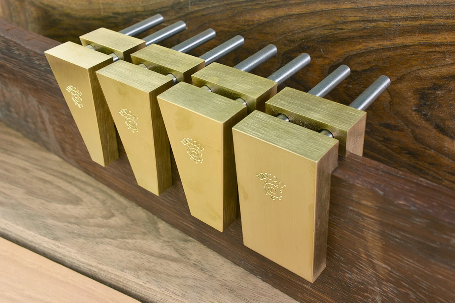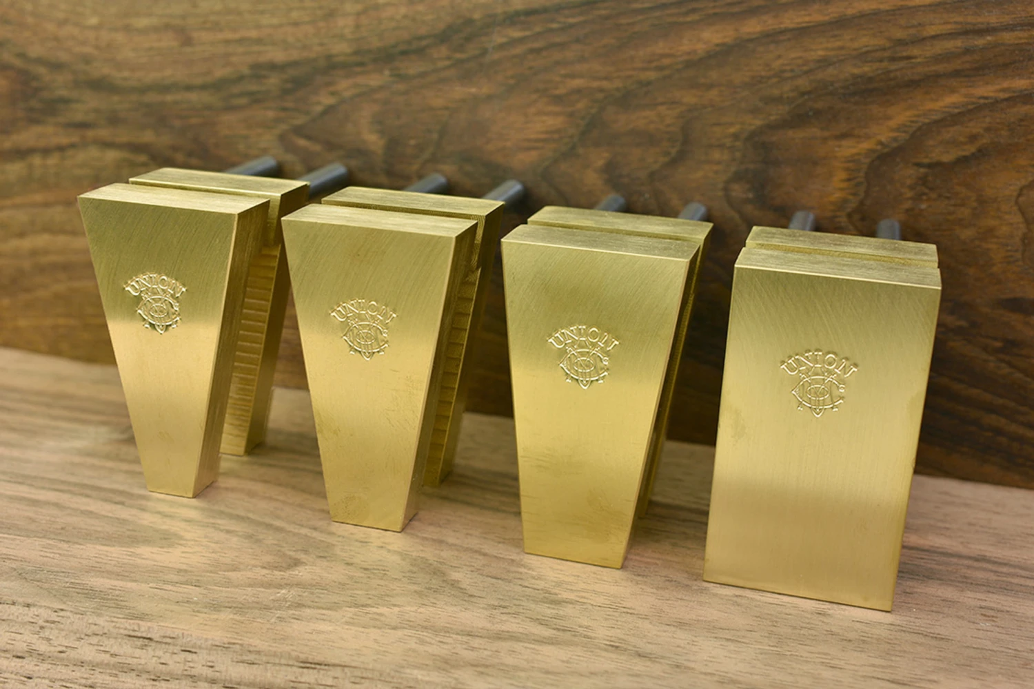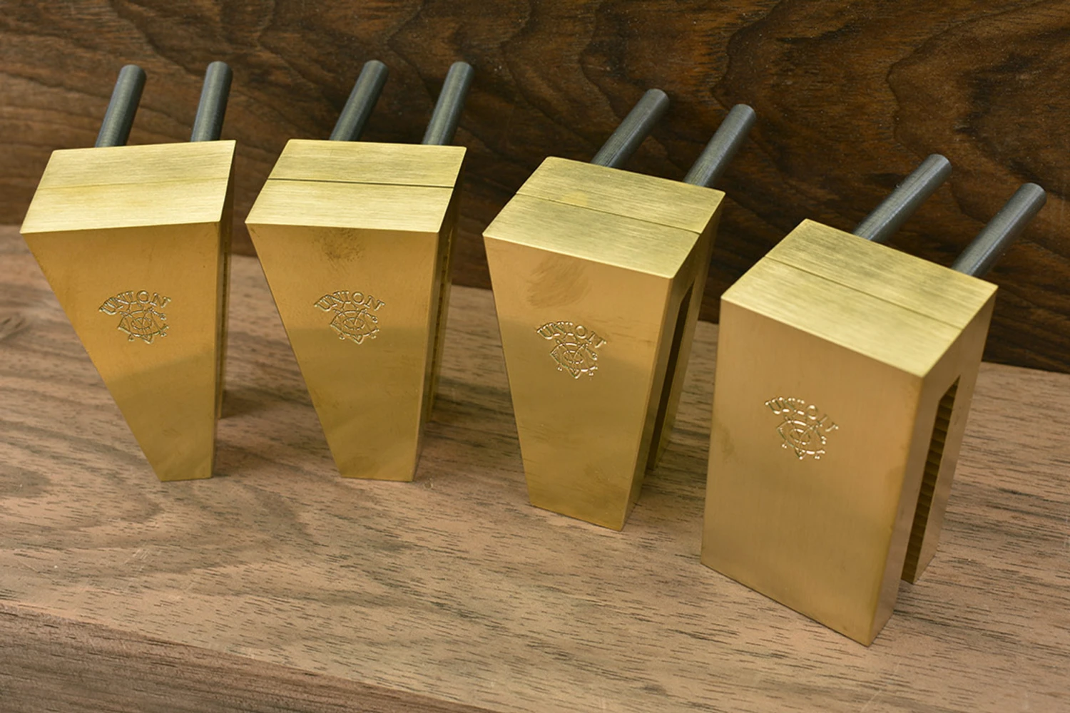 An entirely new style of dovetail marker, unique to Union. The pinch dovetail marker allows you to apply pressure and clamp the work piece between its slightly textured internal faces, eliminating any chance of the marker slipping or sliding during marking.Later production dovetail markers will be stamped with the product number and angles as shown on the Union website. In the meantime, we have a small quantity on hand from the first batch which are only stamped with the Union Mfg Co logo. Set of 4 includes: 90 degree (square) 11 degree (approx 1:5) 9 degree (approx 1:6) 7 degree (approx 1:8)