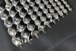 A lovely set of ten early 20th century Wm Ridgway (Sheffield) Jennings pattern auger bits, 1/4″ to 5/8″ by sixteenths, then on up to an inch by eighths. A few little cosmetic marks on the shanks, but the extension lips, cutting spurs and lead screws are all in lovely condition with many years of service remaining. Sizes: 4,5,6,7,8,9,10,12,14,16 + auger file supplied in a new, British made 18 pocket auger roll. These auger bits are pre-owned and not covered by our Lifetime Warranty – please see Terms and Conditions.