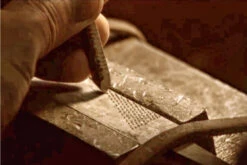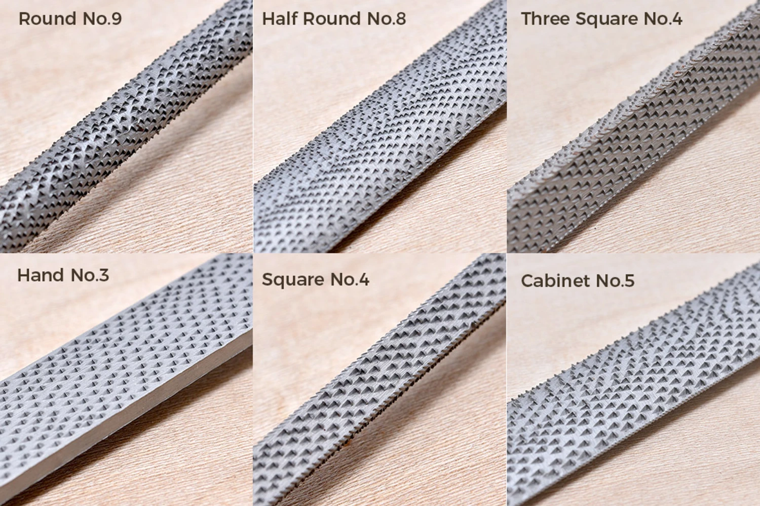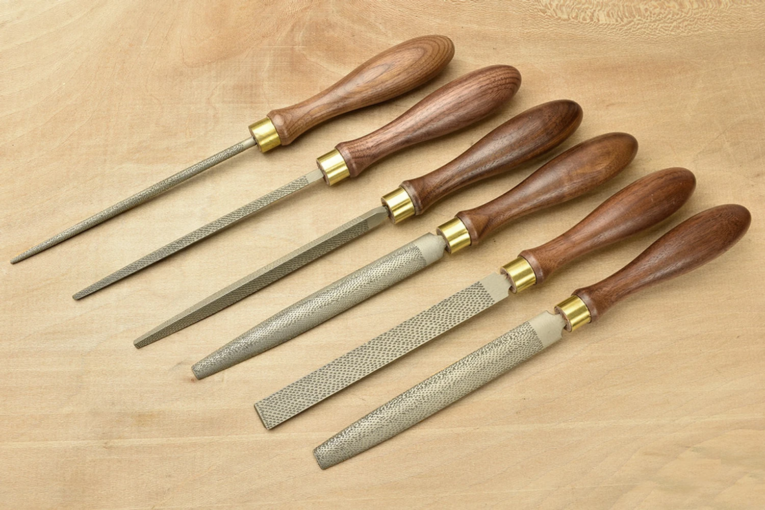 Set Includes: Hand Rasp 150mm No.3 (30tcm) Three-square Rasp 150mm No.4 (40tcm) Square Rasp 150mm No.4 (40tcm) Cabinet Rasp 150mm No.5 (50tcm) Half Round Rasp150mm No.7 (70tcm) Round Rasp 150mm No.9 (90tcm) Supplied in a 12 pocket canvas tool roll to keep the files clean and prevent them from rubbing against each other. A carefully handpicked selection of hand stitched rasps to cover a wide range of small to medium sized work. For curved components, start by laying out the profile of your work in 2D on all the faces of the blank. Remove as much of the excess material as possible by drilling or sawing, then turn to the hand rasp (flat) to tidy up and create a squared off version of the shape with a couple of mm to spare all round. Next comes the cabinet rasp with slightly finer teeth to begin establishing facets, this is the careful process of removing the corners of the squared off version to begin releasing the finished shape. The halfround (finer still and able to form tighter curves) forms tiny facets on the intersections of the facets and then blends the curves together. Its fine teeth leave a surface that is easily sanded, filed or scraped smooth. The round rasp is finer still and can get into tight diameters like the insides of open scrolls, leaving a very good finish. The square and triangular rasps are usually used to open out drilled holes to create shaped ones, think of the arched holes for a plough plane’s fence stems or the space between the feet of a standing animal carving. They can also be handy for producing a clear shape in narrow grooves and tight corners. Each Workshop Heaven hand stitched rasp begins life as a forged and annealed blank of high carbon tool steel is carefully ground and ‘fined’ to a smooth surface before being strapped to a soft anvil to have their teeth individually raised or ‘stitched’ one by one with a special punch and a curved file makers hammer. The handles are turned from English walnut with brass ferrules to a 200 year old Holtzapffel pattern, individually fitted and set by hand for a comfortable, elegant and secure grip. Shoulder to tip: 150mm Overall length: 290mm approx Rasp CareIn order to keep your rasps clean and free from corrosion we recommend removing any clogging from the surface with a stiff bristled brush and applying a few drops of metalguard ultra liquid corrosion inhibitor after each use. Store your rasps in such a way that they cannot touch or rub against each other.