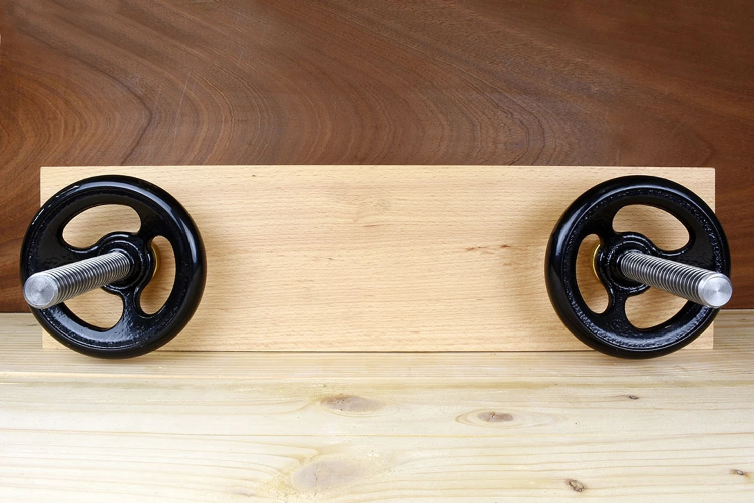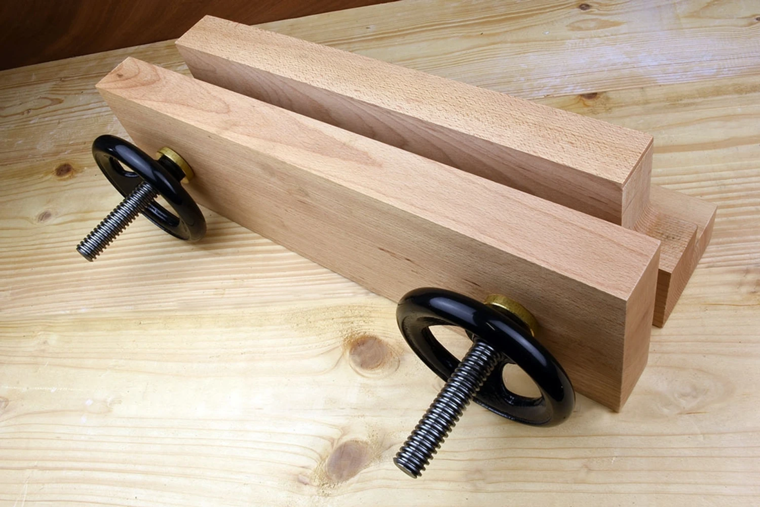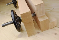 The Moxon vice wasn’t invented by Joseph Moxon, in his book Mechanick Exercises he referred to it as a “double screw vice” and there is evidence of similar devices that pre-date him by some 300 years. It remains however, a very useful tool – a simple demountable system that can be used as required and stored out of the way when not in use.The Moxon vice is held in place with holdfasts or F-clamps, usually on the edge of the bench with the back jaw overhanging the edge by a hair to give full clearance to the floor and raising your working height by 5½” (140mm) above the bench surface. This gives a better position for accurate fiddly jobs on ends and edges – like sawing dovetails, cutting and paring tenons, ploughing grooves etc.With a suitable batten to support it, the Moxon vice can also be used on its back as a clamp (e.g. panel glue ups), mounted in the front vice to clamp work vertically (poor mans patternmakers vice) and its large faces can be pressed into service for small veneering jobs.Drill a couple of dog holes in the top of each block and you have all the versatility of a 1970’s aluminium folding workbench – without the wobble. Cut a V groove in the faces and you can hold small round things safely in the drill press… the only limit is your imagination!The wide jaws are well made from 45mm thick European beech and have a clear 13 inches (33cm) between the screws. The holes in the moving jaw are slotted, giving an allowance for rack – if you have to plane a tapered leg for example. Overall width of Jaws: 500mm Thread: 20mm x 4mm Thread Length: 240mm Maximum Opening 130mm